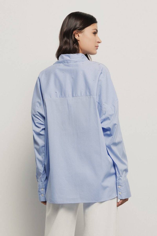 3901 Camicia over con tasche in popeline vichy strass • Azzurro