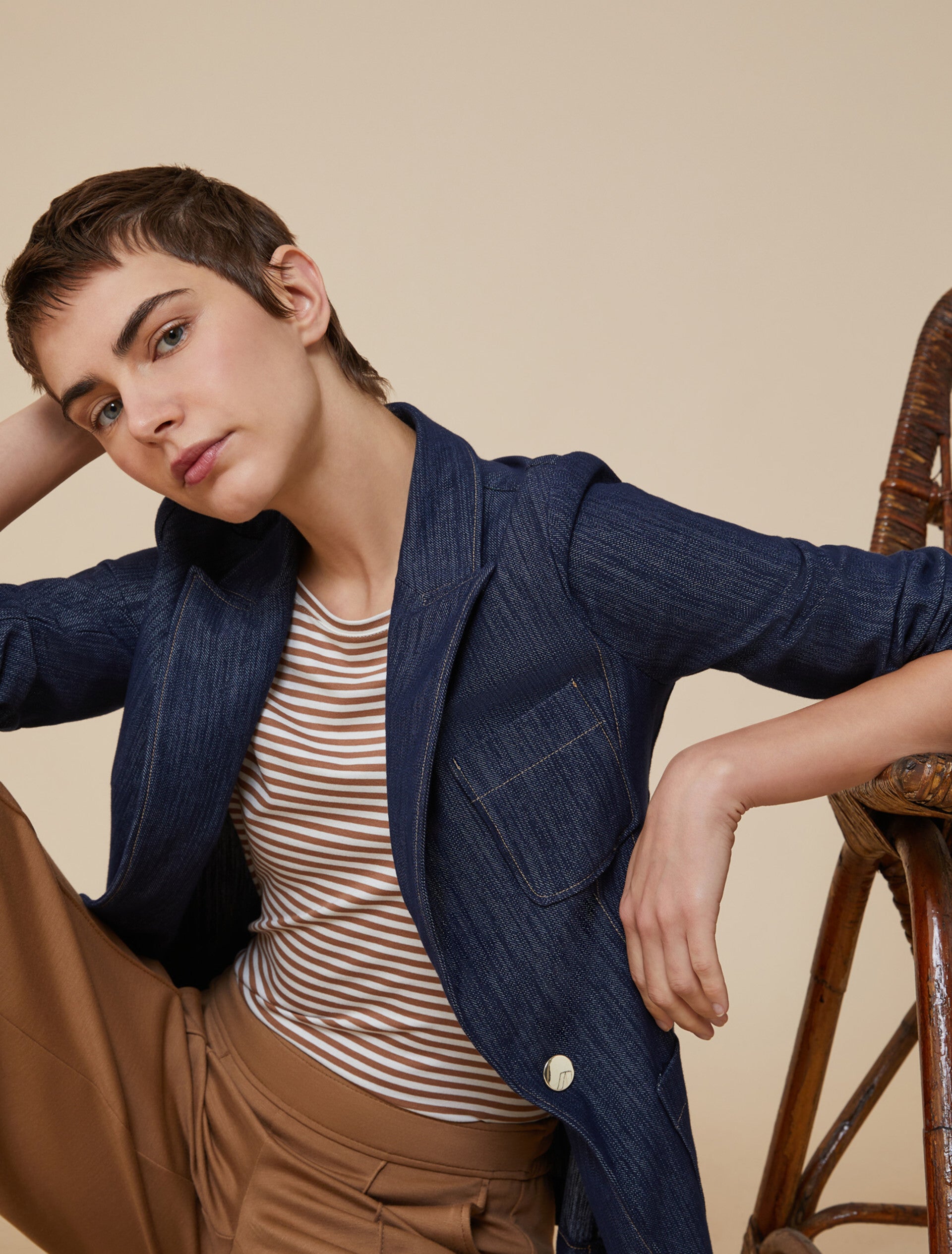 Il comfort del jersey si unisce al fascino del denim sul blazer dal taglio sartoriale impeccabile: match vincente.