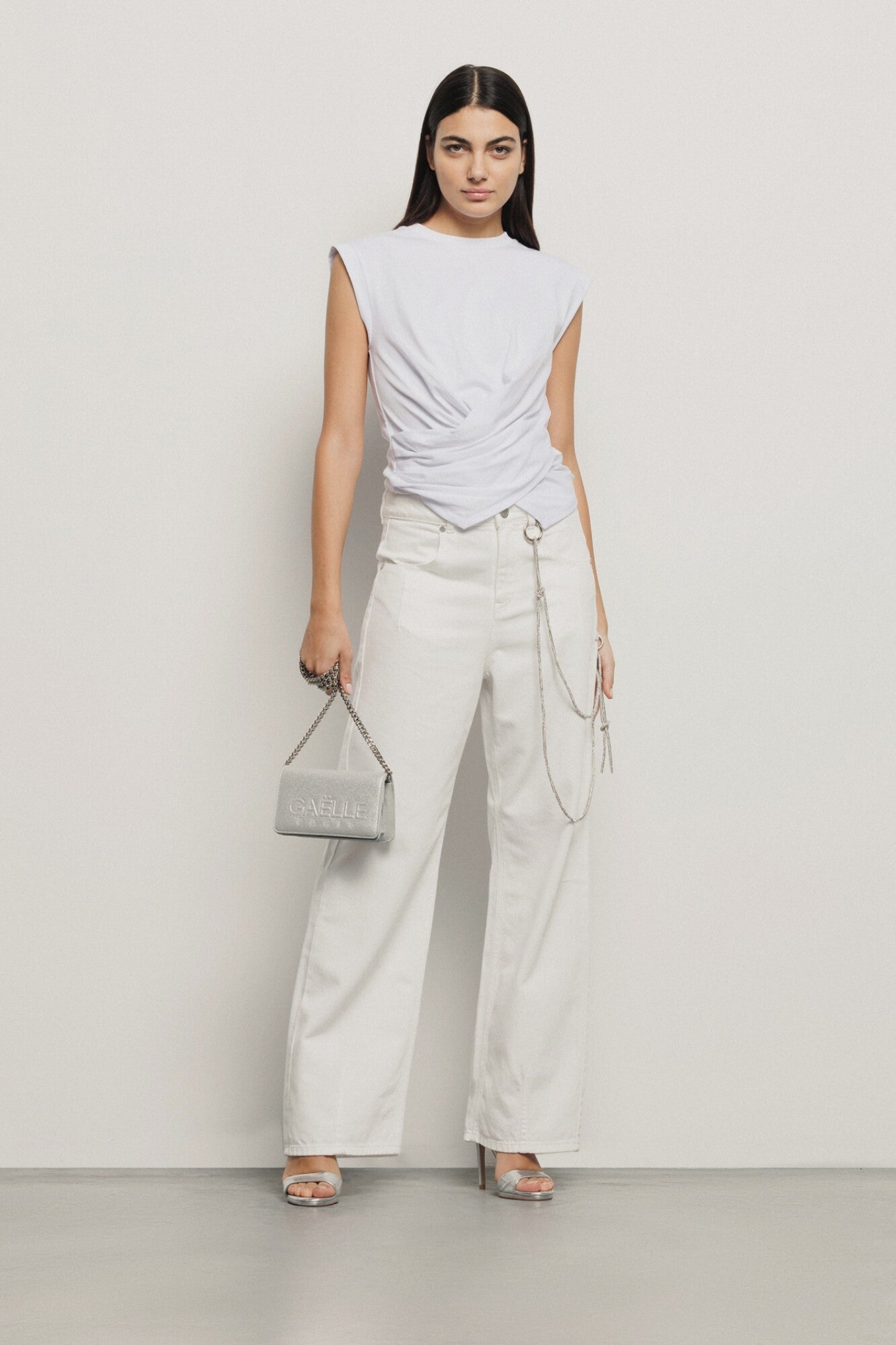 5731 T-shirt smanicata con incrocio sul davanti e logo in strass neri • Bianco