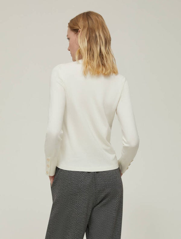 Rifinita con bottoni dorati ai polsi, la maglia dal taglio slim in tricot stretch è un passe-partout nel guardaroba quotidiano. Da indossare sia come sottogiacca che in piena vista.