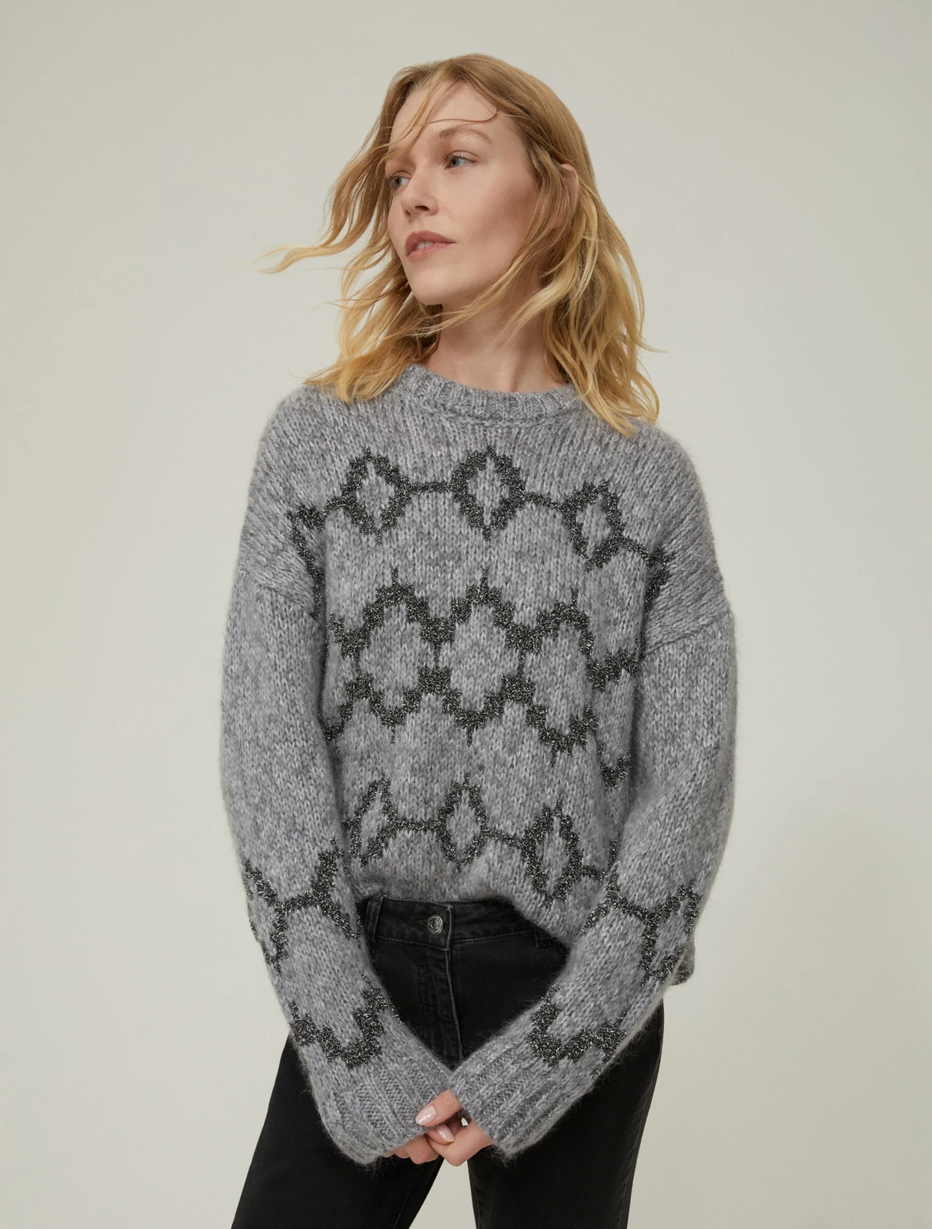 Nuova versione di un grande classico, la maglia in misto mohair mouliné ridisegna i motivi geometrici tradizionali del tricot nordico e li accende con riflessi scintillanti.