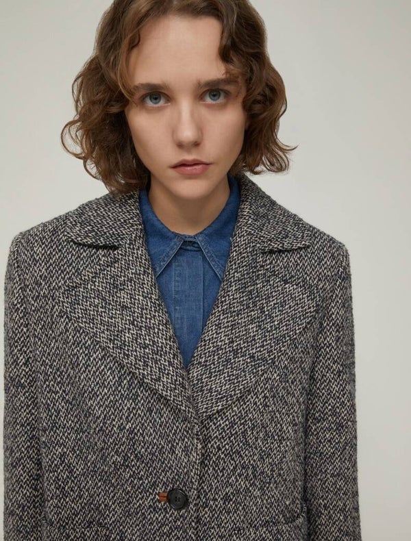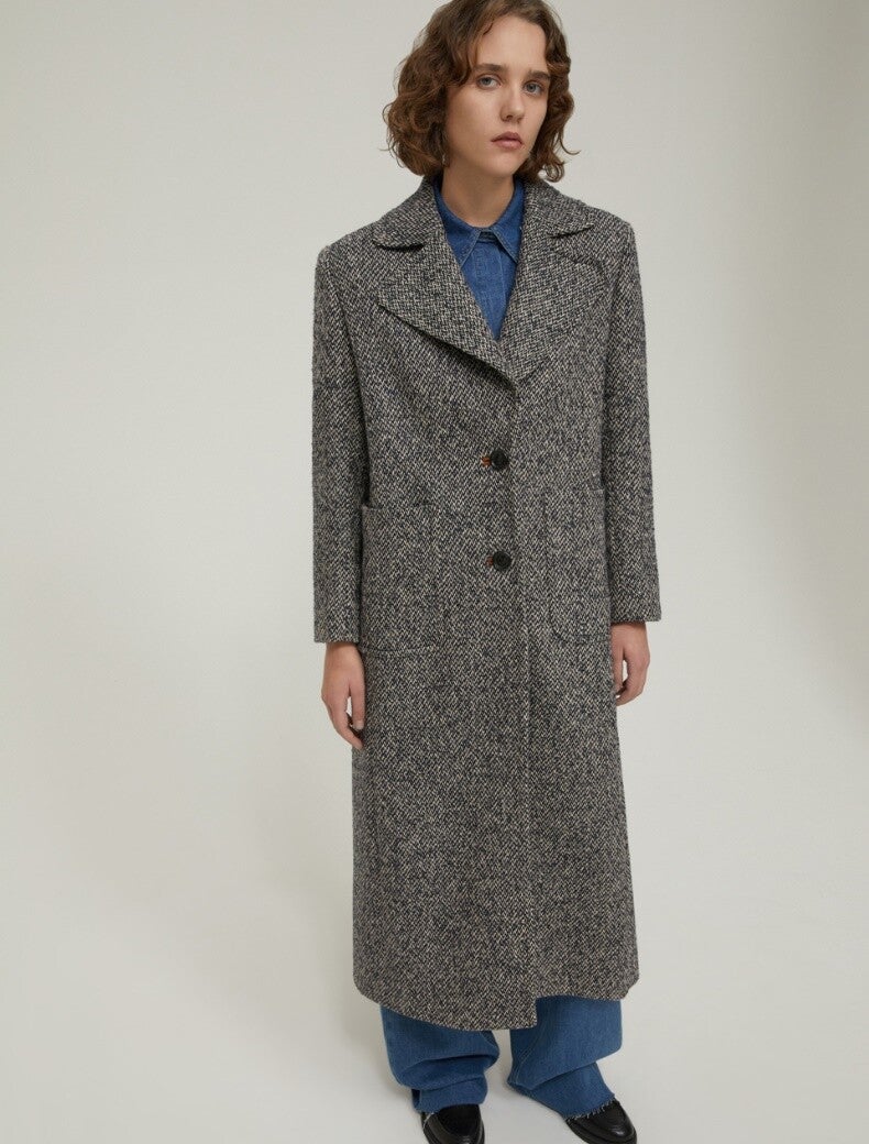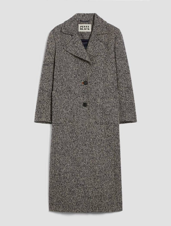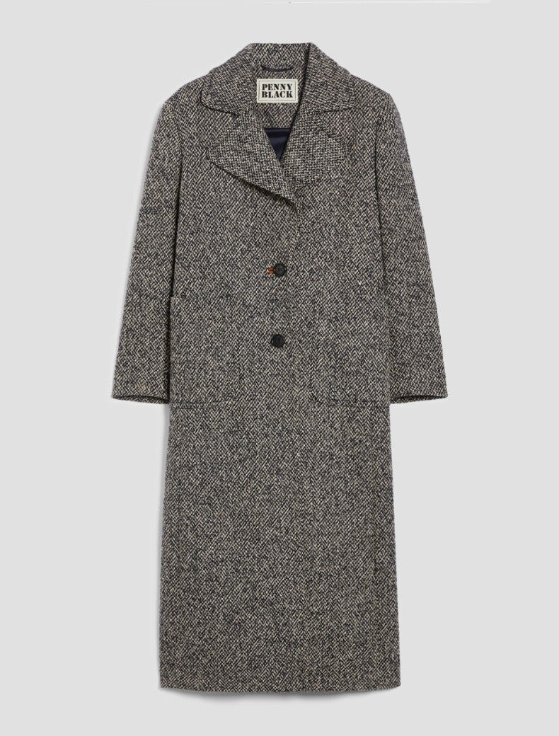 Con una moderna silhouette a matita, il cappotto in tweed interpreta la tradizione British in chiave contemporanea.
