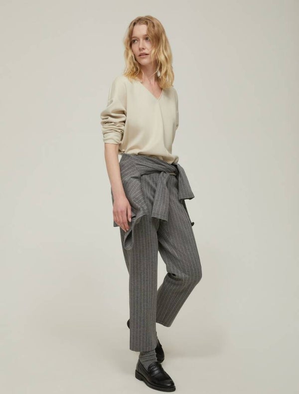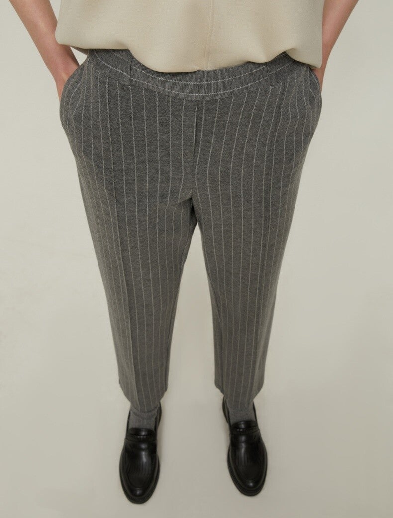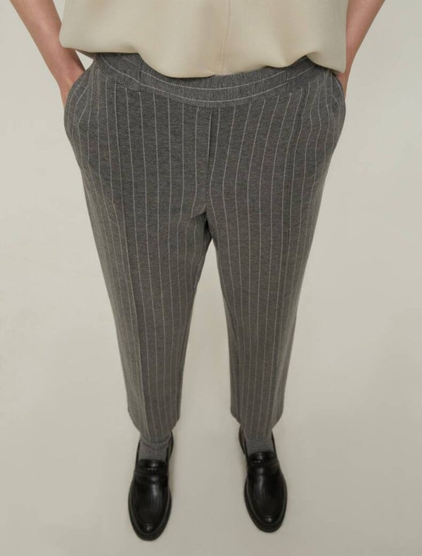 Essenziali nel guardaroba da città, i pantaloni in jersey gessato interpretano lo stile sartoriale all’insegna del comfort.