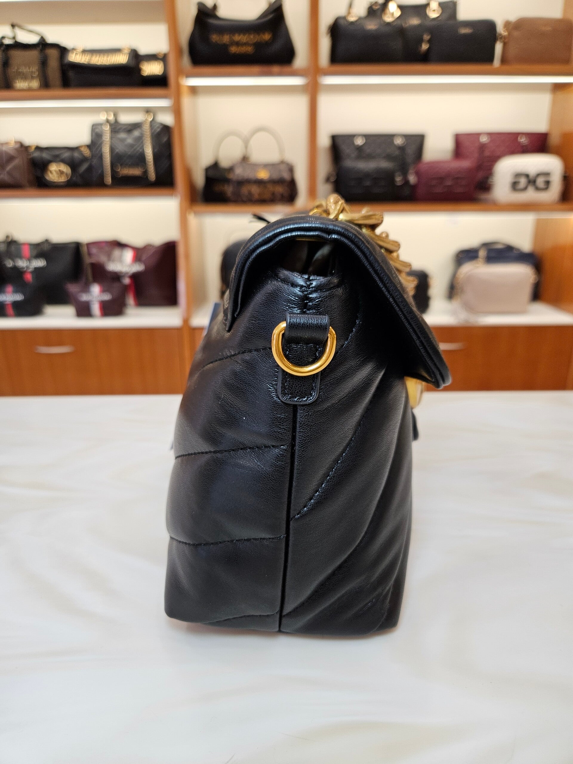 Borsa a tracolla puffy versione grande in morbida ecopelle con trapuntatura. Chiusura magnetica con orsetto e manico in catena effetto invecchiato. Tracolla removibile e fodera interna in cotone con tasca. L 29 H 19 P 11