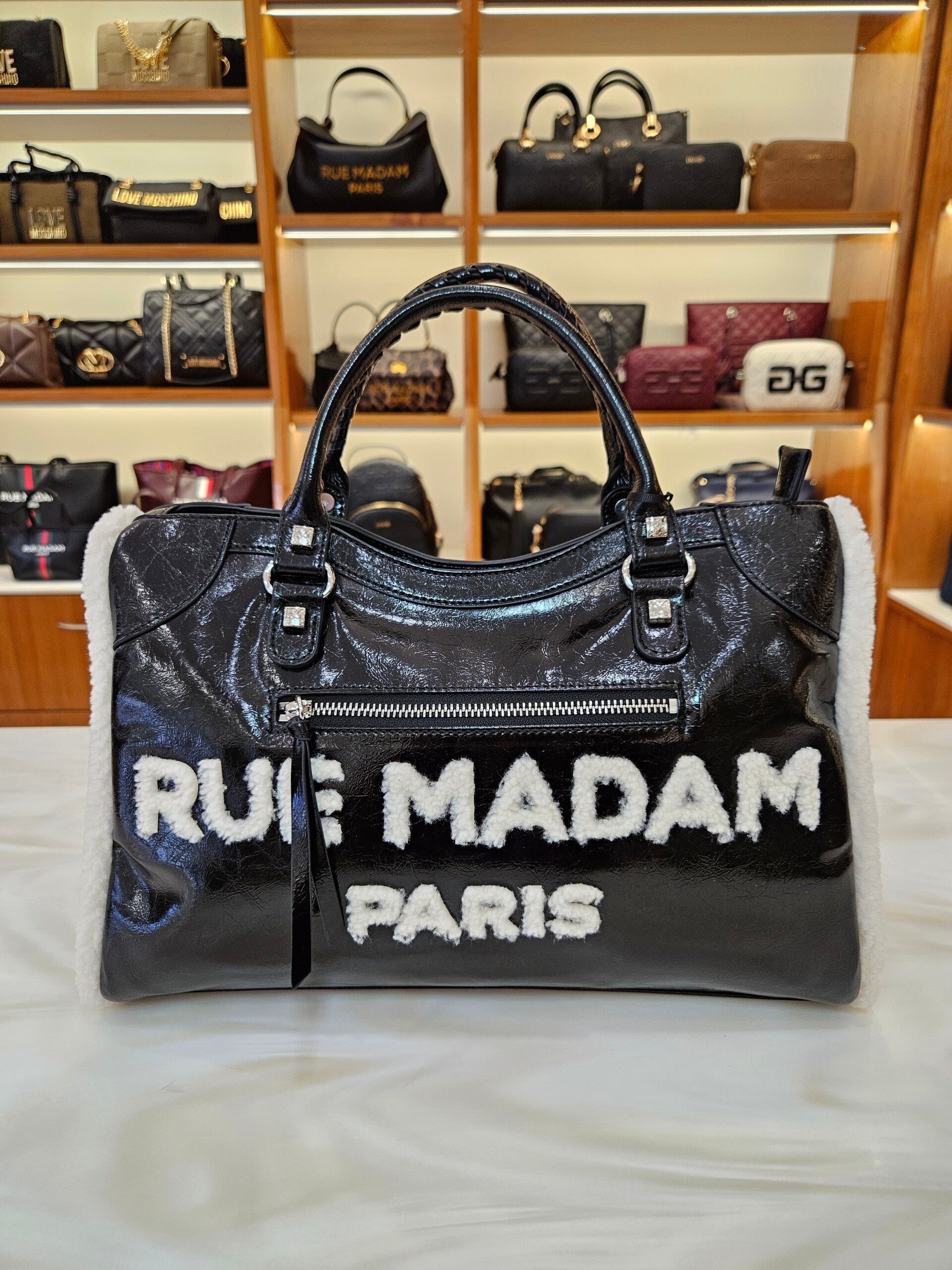 Tote Bag in ecopelle laminata con logo e profili in eco-montone. Tracolla removibile e fodera interna in cotone con tasca. L 38,5 H 25 P 16