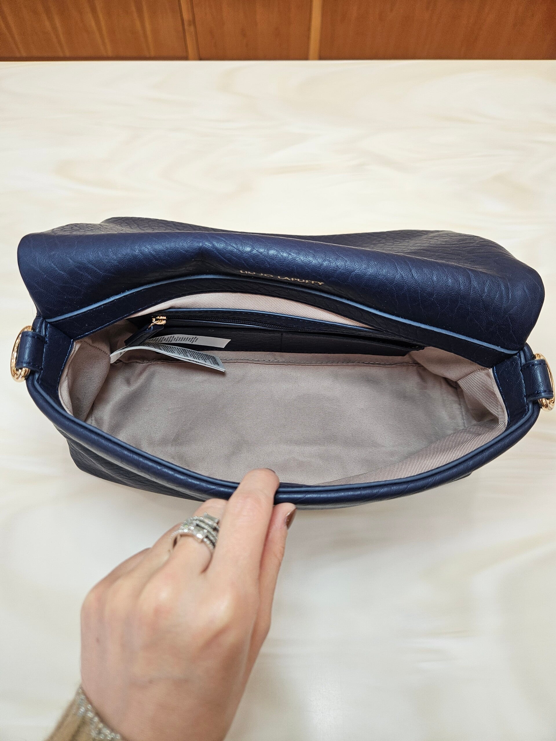 Due tracolle disponibili: una catena corta e una tracolla lunga regolabile in ecopelle blu